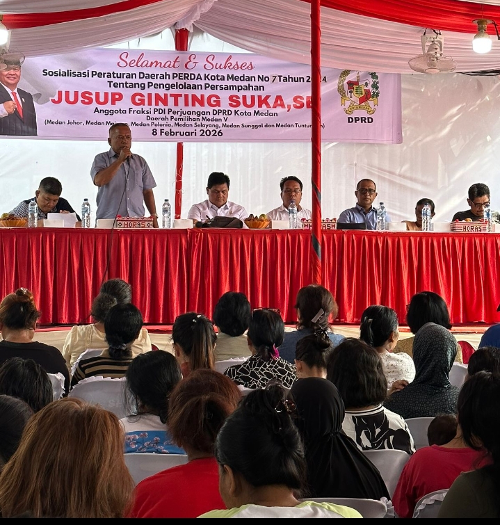 Medan, BLINKISS – Anggota DPRD Kota Medan Fraksi PDI Perjuangan, Jusup Ginting Suka, SE, menegaskan sanksi denda hingga Rp10 juta bagi warga yang melanggar ketentuan dalam Peraturan Daerah (Perda) Kota Medan Nomor 7 Tahun 2024 tentang Pengelolaan Persampahan. Penegasan itu disampaikannya saat Sosialisasi Perda di Jalan Pijer Podi, Kelurahan Beringin, Kecamatan Medan Selayang, Minggu (8/2/26) sekira pukul 15.00 Wib.