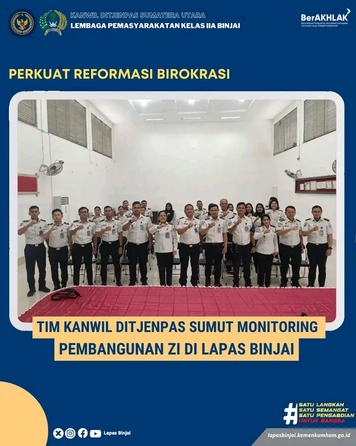 Lembaga Pemasyarakatan (Lapas) Kelas IIA Binjai menerima kunjungan Tim Monitoring dan Evaluasi (Monev) dari Tim Perencanaan dan Reformasi Birokrasi Kantor Wilayah Direktorat Jenderal Pemasyarakatan Sumatera Utara, Rabu (11/03/2026). Kunjungan ini dilaksanakan dalam rangka monitoring dan evaluasi pelaksanaan Pembangunan Zona Integritas (ZI) menuju Wilayah Bebas dari Korupsi (WBK) dan Wilayah Birokrasi Bersih dan Melayani (WBBM).
