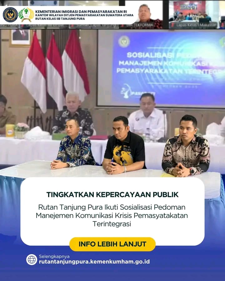 Kegiatan ini dilaksanakan sebagai bentuk upaya memperkuat kepercayaan publik serta pengelolaan komunikasi krisis dilingkungan pemasyarakatan. Diikuti secara virtual oleh Karutan Tanjung Pura, Fransisco Pandia serta pejabat struktural, sosialisasi ini merupakan langkah dalam membangun transparasi informasi serta komunikasi yang cepat tanggap dalam menghadapi situasi krisis sehingga masyarakat menerima informasi dengan benar.