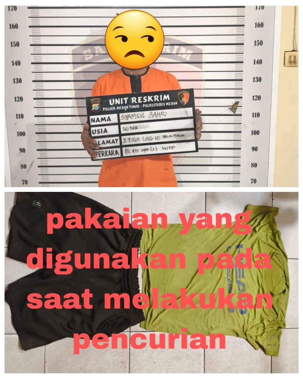 Adapun identitas pelaku pencuri tersebut bernama Syamsul Bahri (56), pekerjaan mocok-mocok, Alamat pelaku Jl.Tiga, Link 10, No. B62, Kel. Pulo Brayan Bengkel Baru, Kec. Medan Timur.