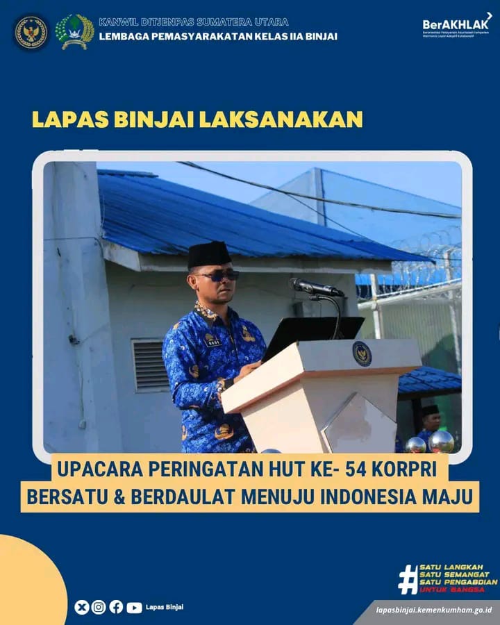 Dalam rangka memperingati Hari Ulang Tahun (HUT) ke-54 Korps Pegawai Republik Indonesia (KORPRI) Tahun 2025, Lapas Kelas IIA Binjai melaksanakan upacara bendera yang bertempat di Lapangan Upacara Lapas. Senin (01/12/2025). Kalapas Binjai, Wawan Irawan yang diwakili oleh Ka. KPLP, Rudi Sembiring memimpin langsung jalannya upacara dan diikuti oleh seluruh jajaran pegawai Lapas Binjai, serta peserta program magang Kementerian Ketenagakerjaan.