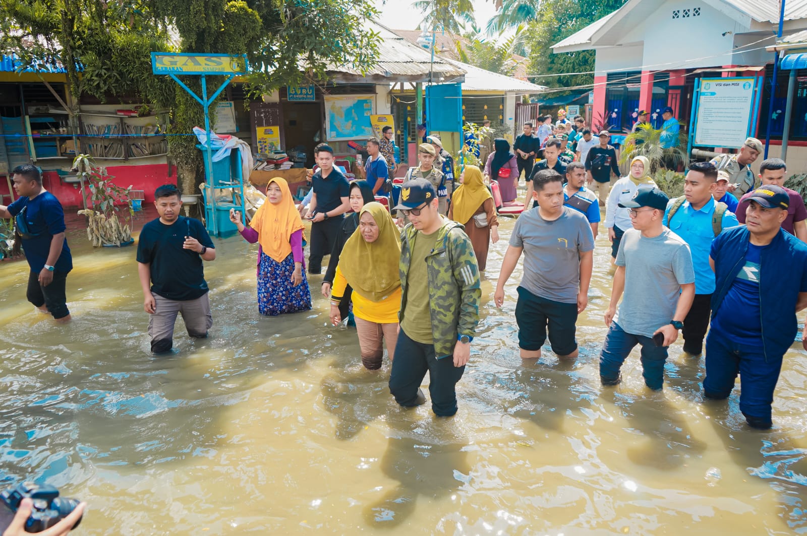Wali Kota Medan, Rico Tri Putra Bayu Waas bersama dengan Wakil Wali Kota Medan, H. Zakiyuddin Harahap, meninjau SDN 066429 di jalan Baru, Kel. Terjun, Kec. Medan Marelan yang kondisinya memprihatinkan akibat diterjang banjir, Rabu (3/12/2025).