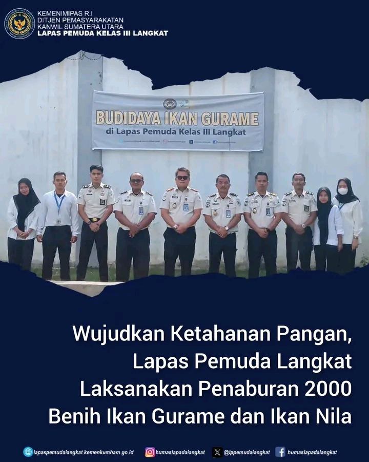 Dalam rangka mewujudkan Asta Cita Presiden dan Akselerasi Menteri Imigrasi dan Pemasyarakatan dalam hal ketahanan pangan, Lapas Pemuda Langkat laksanakan wujud nyata yaitu penaburan benih ikan Nila dan gurame. Kalapas Pemuda Kelas III Langkat, Kenal Purba, bersama para pejabat struktural, memimpin langsung kegiatan penaburan bibit ikan nila dan gurami, Kamis (05/03/2026).